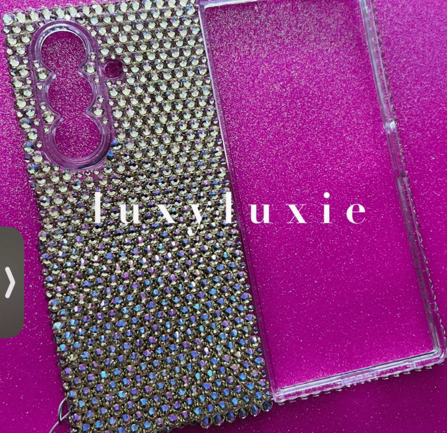 Samsung Z Fold 7 clear case with aquamarine Swarovski crystals on the back and sides as per image supplied.